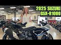 - The 2025 GSX-R1000 aerodynamic bodywork is coated in a new Candy Daring Red and Glass Sparkle Black with dark red wheels, or a Mechanical Matte Sword Silver with new, bright blue graphics on the fairing and on the black wheels.